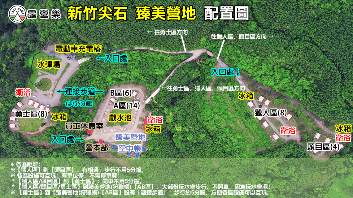 ※ 【臻美營地(狩獵帳)【AB區】到【勇士區】到,設有「連接步道」:步行約5分鐘,方便各區設施可以互玩。